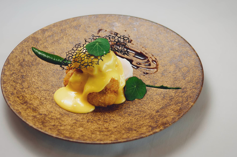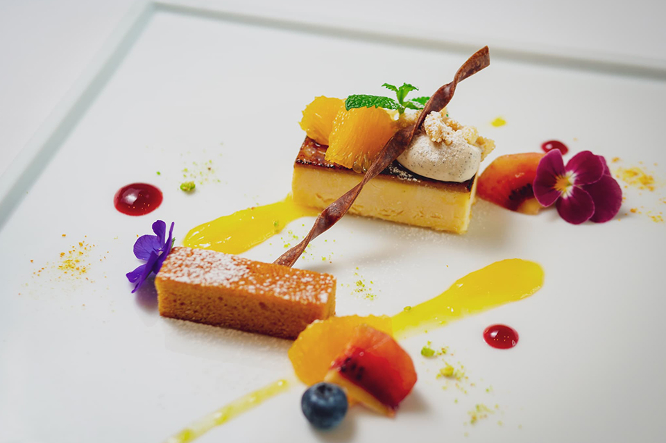 - 紅茶のカタラーナとキャラメルケーキ オレンジのソース