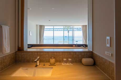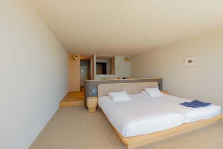 大きなベッドと洗練されたインテリアにミニキッチンやDVDも完備。浴室からは瀬戸内の海が一望できます。