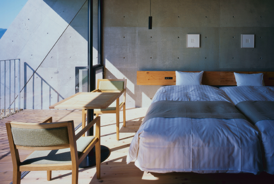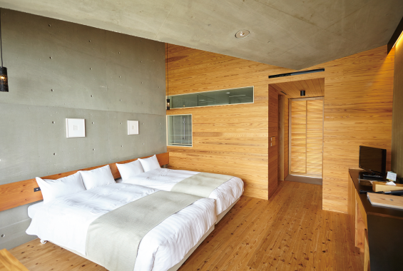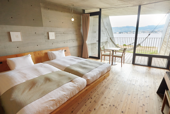 ベッドを隣り合わせにしたハリウッドタイプ。対岸に広がる山並みをより近くに感じて。