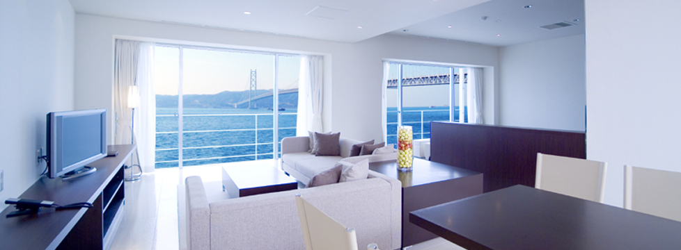 大きなベッドと洗練されたインテリアにミニキッチンやDVDも完備。浴室からは瀬戸内の海が一望。ココロもカラダも和むお部屋です。