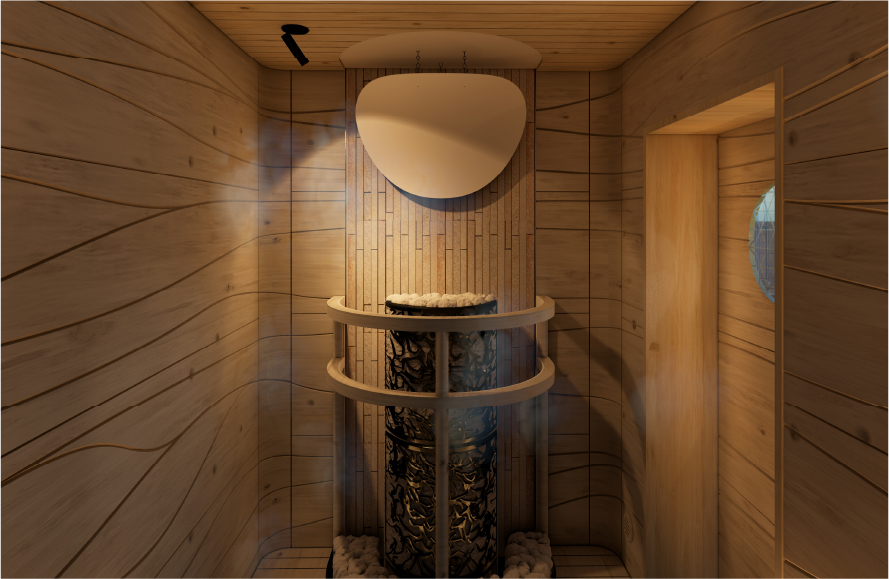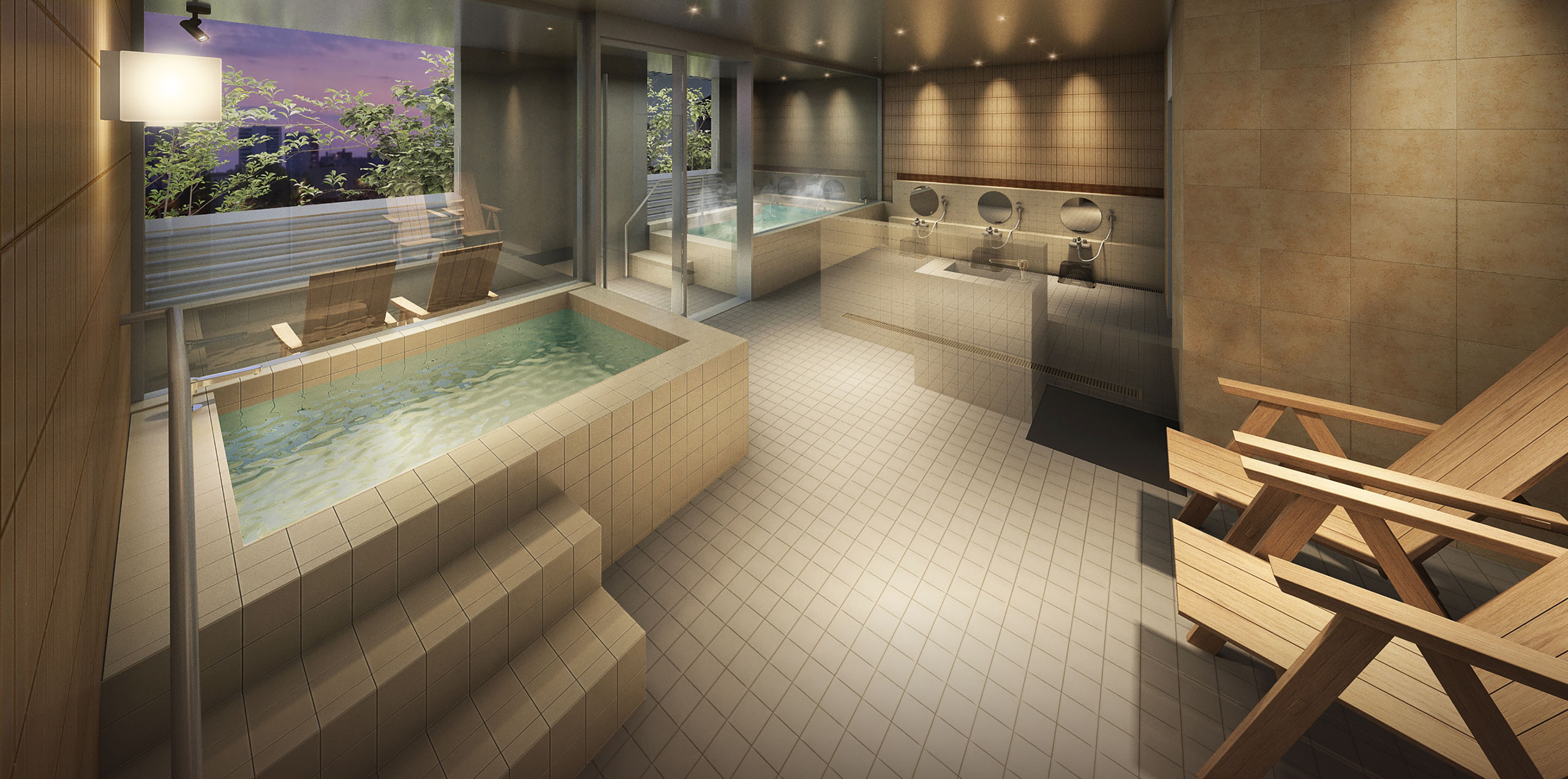 愛知の木材を使ったサウナと、運河の気配を感じる半屋外の湯。