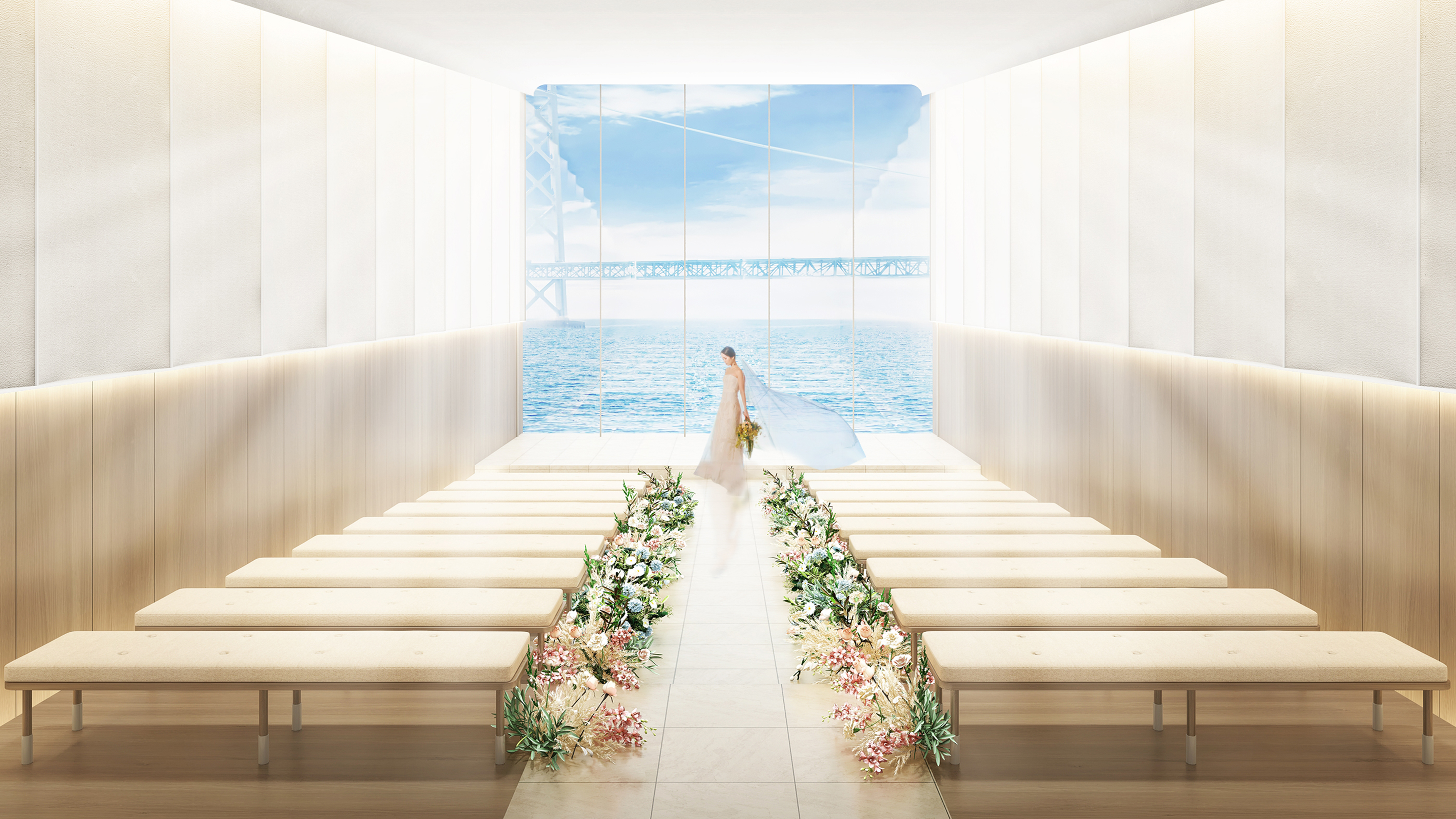 まるで新郎新婦が海に浮いているように見えるSETREのチャペルは