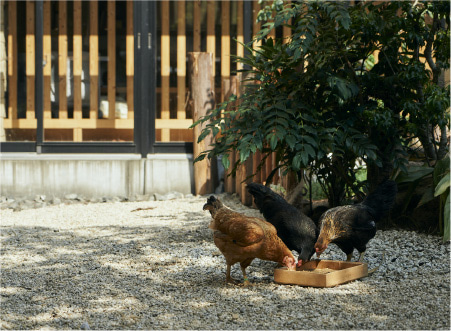 BIOYARD has five free-range Yamato Nikudori chickens,