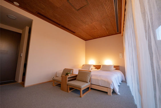 Up to four guests can be accommodated with the Hollywood type two beds arranged side by side, and two futons (sets of Japanese mattresses and quilts) available in the Japanese room. Ideal for friends staying together and families.